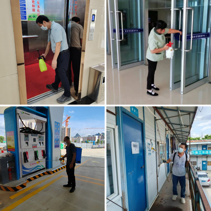 消殺人員全面對(duì)集團(tuán)辦公區(qū)域樓道、會(huì)議室、衛(wèi)生間等部位進(jìn)行環(huán)境消殺,對(duì)辦公室門(mén)把窗鎖、電腦鍵盤(pán)鼠標(biāo)、座椅扶手等頻繁接觸部位進(jìn)行清潔消毒;對(duì)物管小區(qū)大門(mén)、單元入戶(hù)門(mén)、小區(qū)綠化帶、樓梯通道、電梯轎廂、樓梯扶手、垃圾桶、信報(bào)箱等各公共區(qū)域進(jìn)行全面擦洗消毒,及時(shí)清運(yùn)小區(qū)垃圾,清理衛(wèi)生死角;對(duì)平安立體停車(chē)庫(kù)、平安加油站、姑婆山小鎮(zhèn)路花新村項(xiàng)目、城東污水處理廠項(xiàng)目等開(kāi)展防控消殺。僅一天時(shí)間,城投集團(tuán)共消殺辦公場(chǎng)所處,項(xiàng)目工地個(gè),物管小區(qū)個(gè),進(jìn)行了“無(wú)死角、無(wú)盲區(qū)、全覆蓋”的地毯式消毒作業(yè)。
