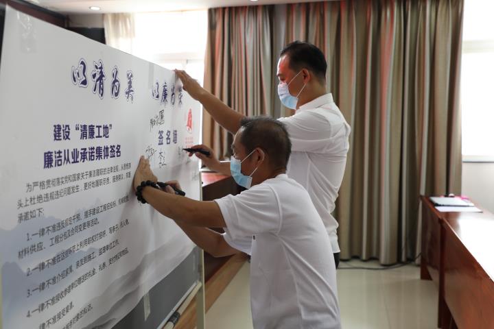 活動(dòng)重溫了入黨誓詞,聘請(qǐng)各項(xiàng)目監(jiān)理單位人員為“廉政監(jiān)督員”,并在清廉工地承諾墻上開展集體簽名活動(dòng),立下高質(zhì)量建設(shè)“清廉工地”的錚錚誓言。“廉政監(jiān)督員”們圍繞自身工作實(shí)際,談履職,話清廉,對(duì)“清廉工地”建設(shè)建言獻(xiàn)策,扎實(shí)推進(jìn)黨建領(lǐng)廉、文化助廉等廉政建設(shè)。