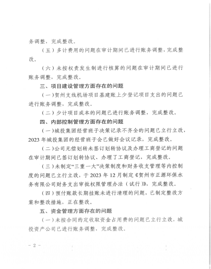 廣西賀州城建投資集團(tuán)有限公司2022年度財(cái)務(wù)收支情況審計(jì)整改情況公告